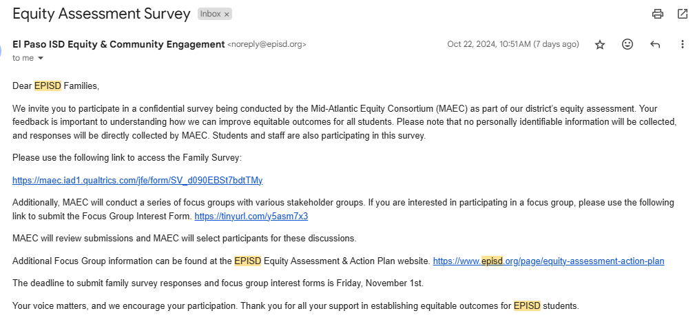 El 22 de Octubre, el Distrito Escolar Independiente de El Paso, notificó, a los padres de familia y tutores, por medio de correos electronicos y textos acerca de una encuesta sobre “equidad”. (Equity Assesment Survey).
